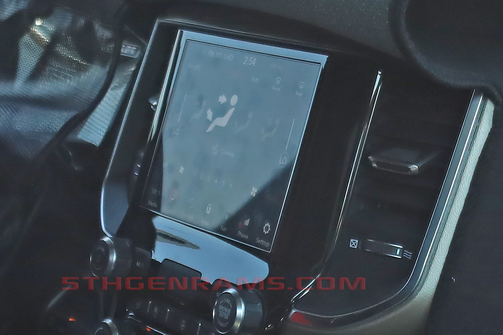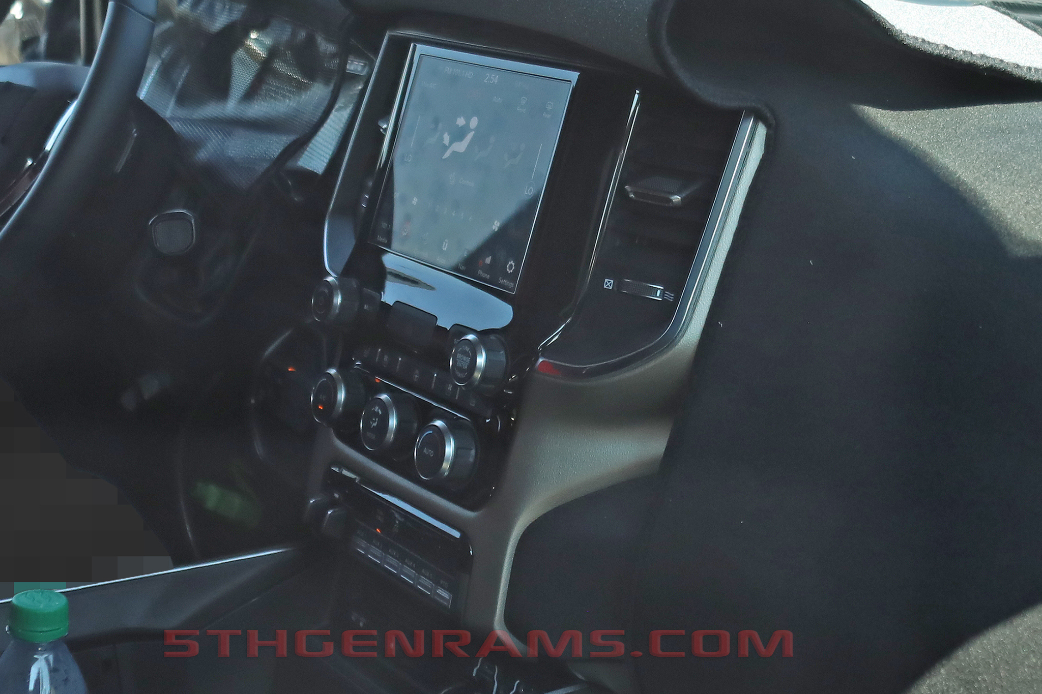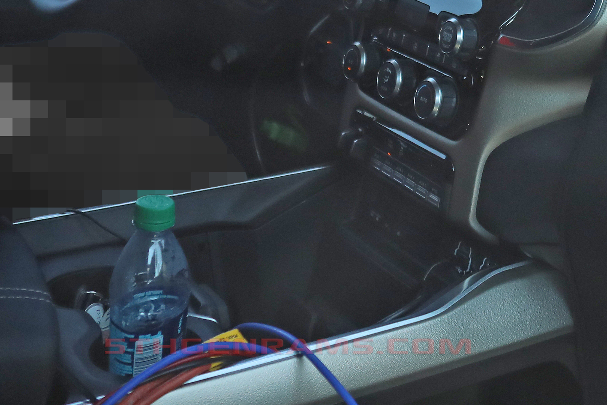 Brian Williams of Spiedbilde photography recently snapped these interior shots of the 2019 Ram HD. While most of the dash is still covered in camo we can see that the center stack is similar to the 2019 Ram 1500. The big difference, of course, is the column shifter instead of the knob shifter but another difference that we notice is that it looks like there are auxiliary switches mounted on the bottom of the center stack where the toggle switches for air suspension, tow haul mode etc are on the 1500s. This particular truck also has a PTO (Power Take Off) button. We previously predicted the aux switches replacing those controls in this article. This truck has the 8.4 inch UConnect 4C system but we expect the massive 12 inch display to be an option as well.