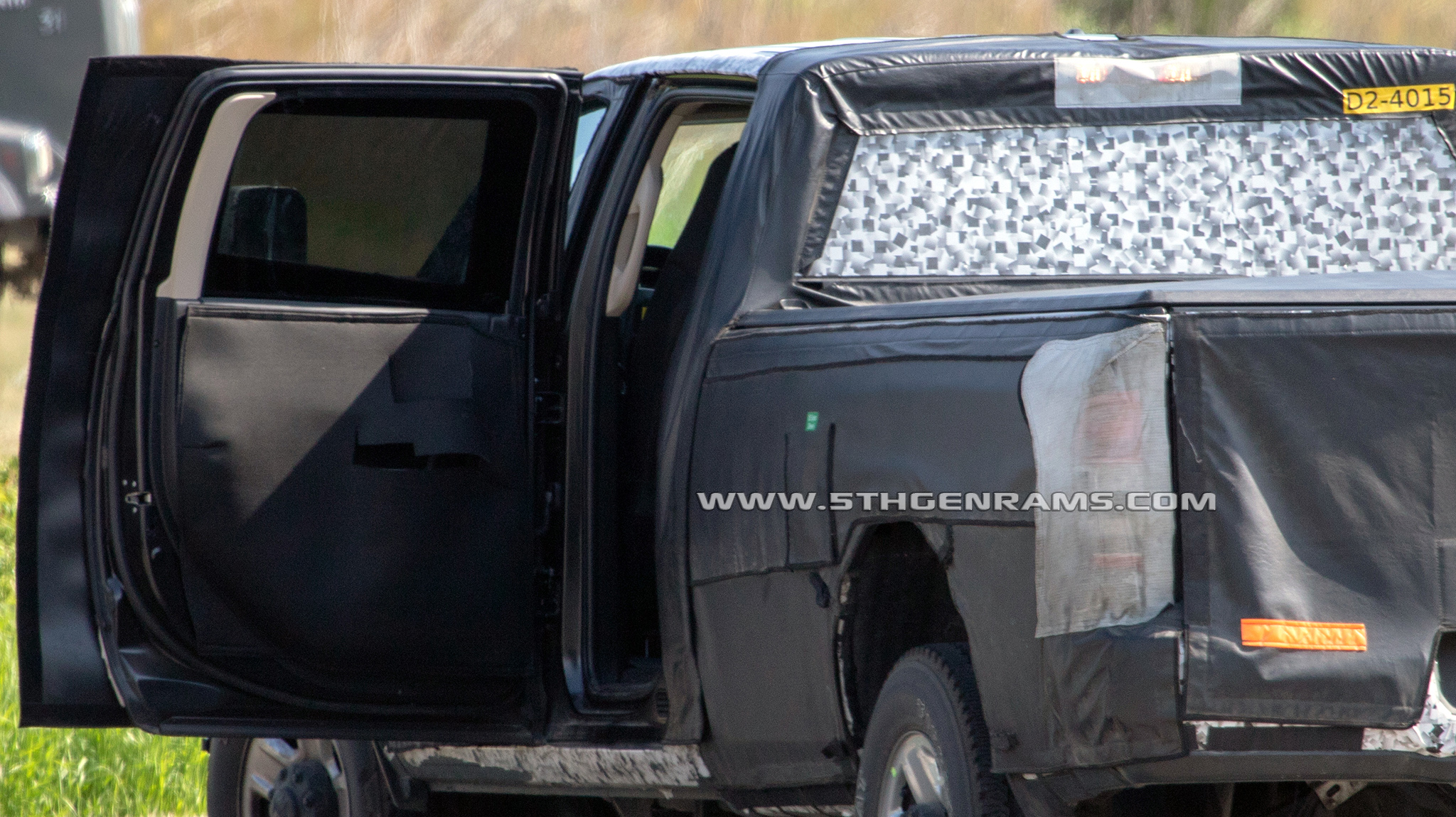 Our friend’s at Real Fast Fotography, shot pictures of the rear door open on this 2020 Ram 3500 Crew Cab Tradesman prototype. The interior of the door panel is highly camouflaged, however we can see that the new Heavy Duty has the same interior rear door trim as the current Heavy Duty models around the windows as well as the same rear assist grab handle.