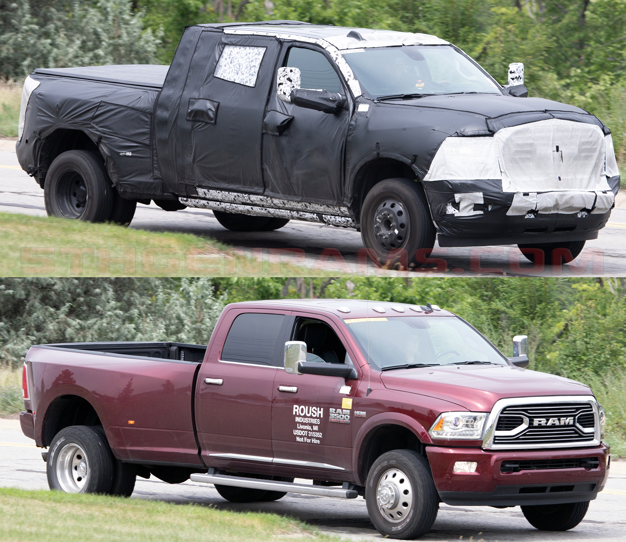 Thanks to our friend’s at Real Fast Fotography we have put together two images of test vehicles caught from the same exact angle. Both are trucks are 3500 DRW models. However, the camouflaged one is a 2020 Ram 3500 Mega Cab DRW Laramie Longhorn Prototype, while the other is a 2019 Ram 3500 Crew Cab DRW Laramie Longhorn.