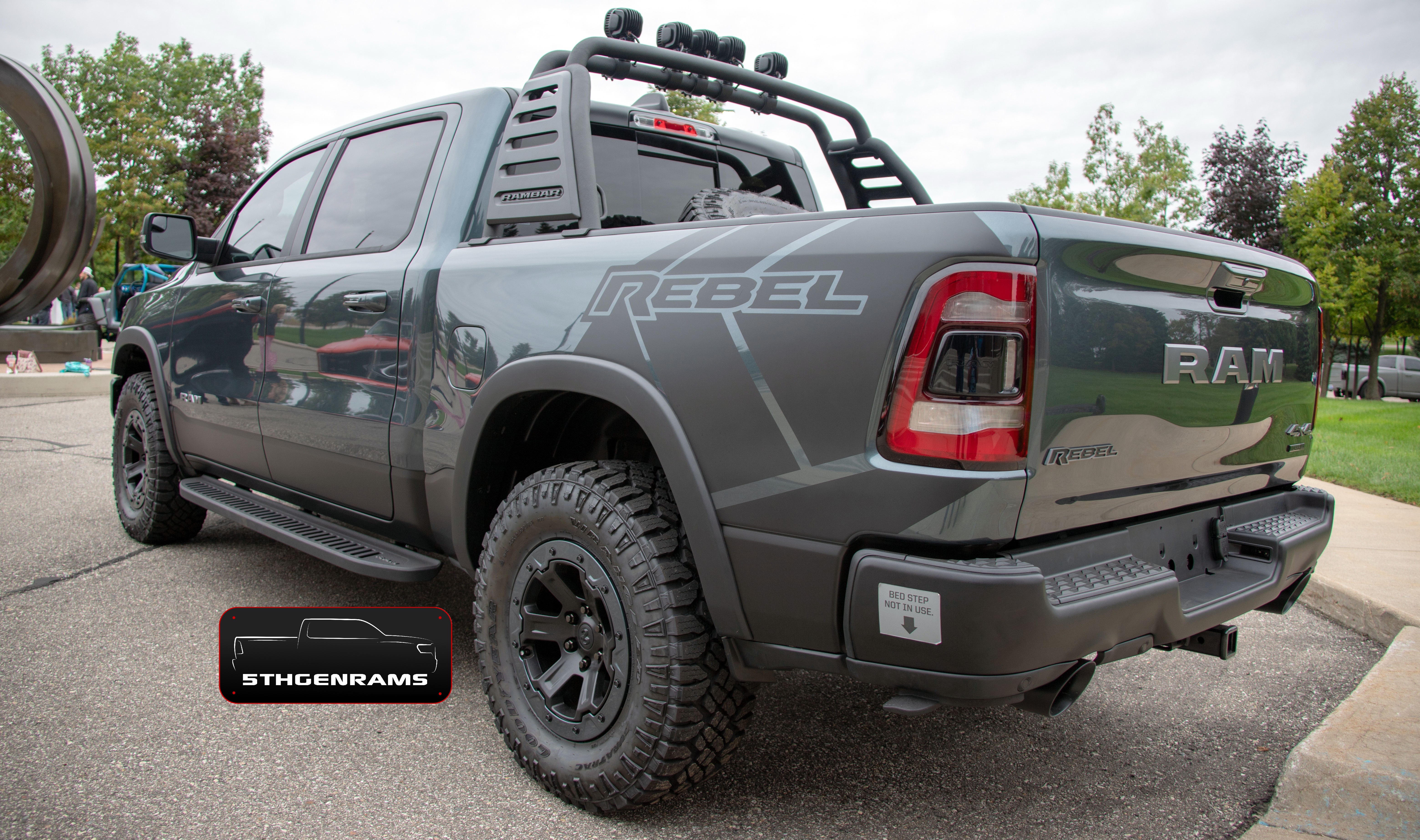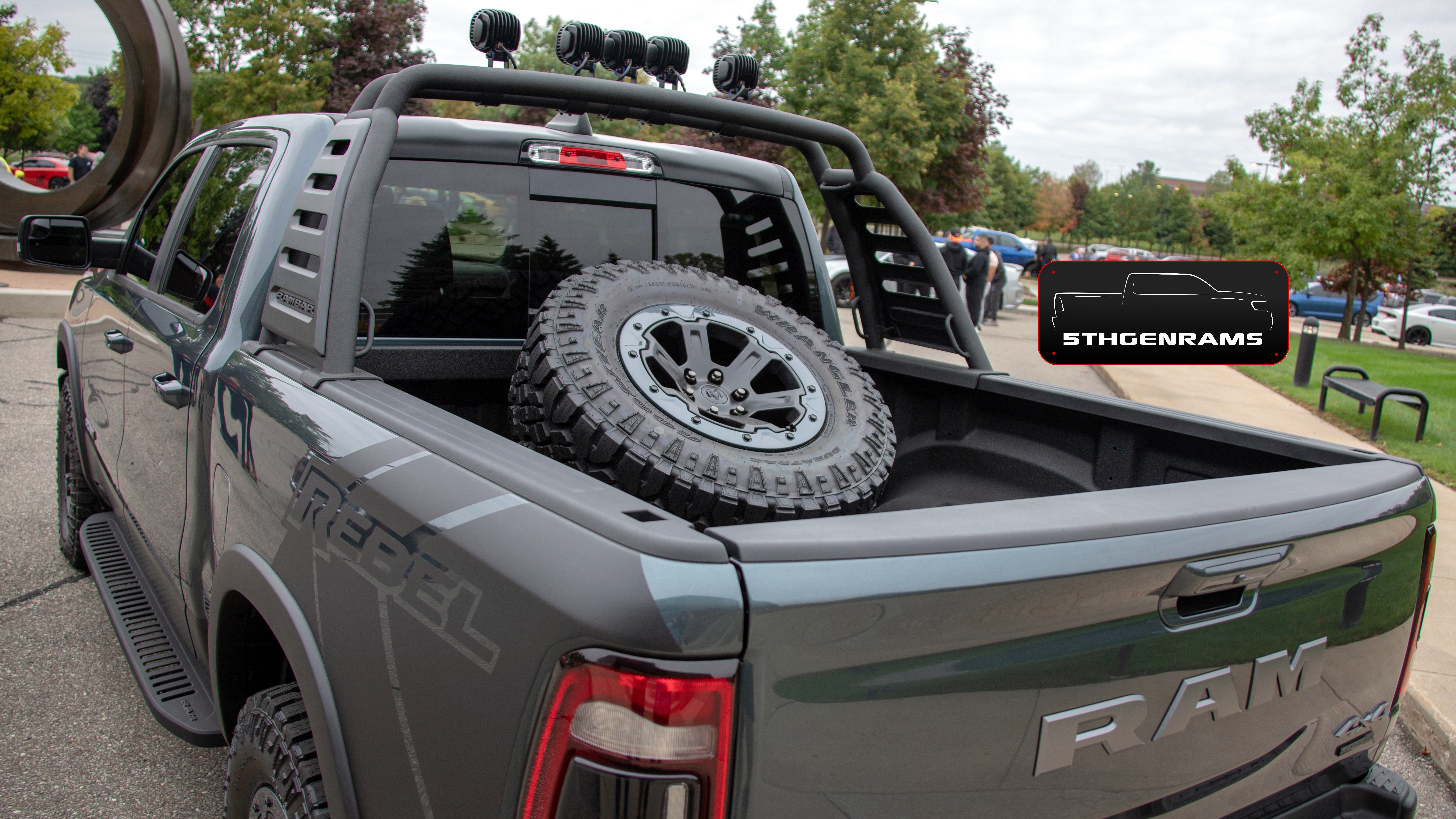 A Ram Bar in the bed acts as a mounting location for five 5-inch LED lights that illuminate the trail at a bright 4,800 lumens each. The bed also incorporates a conceptual rear spare tire carrier, Mopar rear bed step, and black spray-in bed liner. Satin Black Rebel graphics from Mopar dress up the bedsides and Mopar 5-inch Gloss Black exhaust tips complete the rear custom touches.