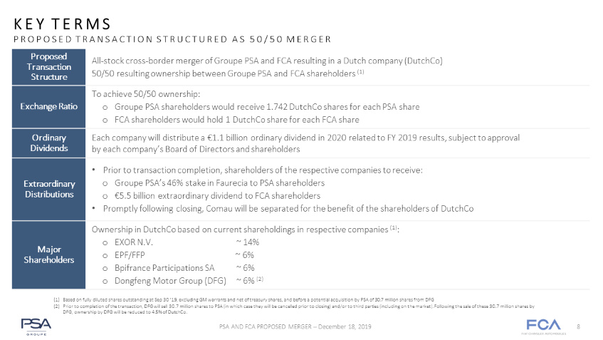 Before closing, FCA will distribute to its shareholders a special dividend of €5.5 billion while Groupe PSA will distribute to its shareholders its 46% stake in Faurecia. In addition, FCA will continue to work on the separation of its holding in Comau which will be separated promptly following closing, for the benefit of the shareholders of the combined company. This will enable the combined group’s shareholders to equally share in the synergies and benefits that will flow from a merger while recognizing the significant value of both Groupe PSA and FCA’s assets and strengths in terms of market share and brand potential. Each company intends to distribute a €1.1 billion ordinary dividend in 2020 related to the fiscal year 2019, subject to approval by each company’s Board of Directors and shareholders. At closing, Groupe PSA shareholders will receive 1.742 shares of the new combined company for each share of Groupe PSA, while FCA shareholders will have 1 share of the new combined company for each share of FCA.