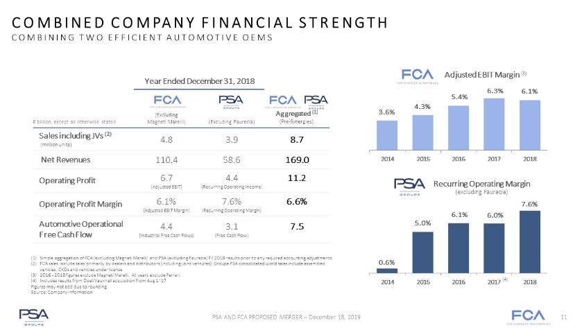 The combined company will have annual unit sales of 8.7 million vehicles, with revenues of nearly €170 billion, recurring operating profit of over €11 billion and an operating profit margin of 6.6%, all on a simple aggregated basis of 2018 results. The strong combined balance sheet provides significant financial flexibility and ample headroom both to execute strategic plans and invest in new technologies throughout the cycle.