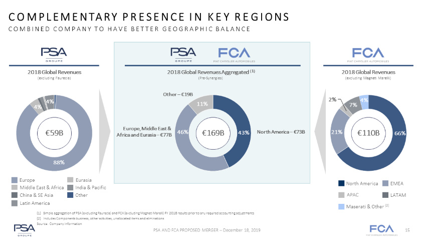 The combined entity will have a balanced and profitable global presence with a highly complementary and iconic brand portfolio covering all key vehicle segments from luxury, premium, and mainstream passenger cars through to SUVs and trucks & light commercial vehicles. This will be underpinned by FCA’s strength in North America and Latin America and Groupe PSA’s solid position in Europe. The new Group will have a much greater geographic balance with 46% of revenues derived from Europe and 43% from North America, based on aggregated 2018 figures of each company. The combination will bring the opportunity for the new company to reshape the strategy in other regions.