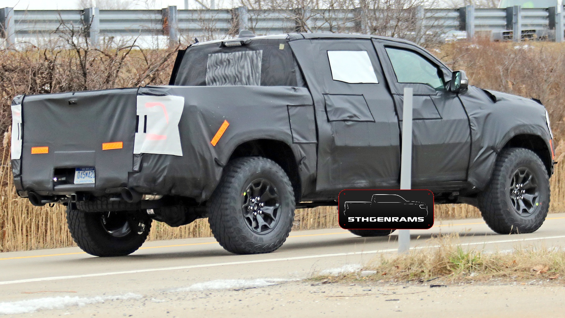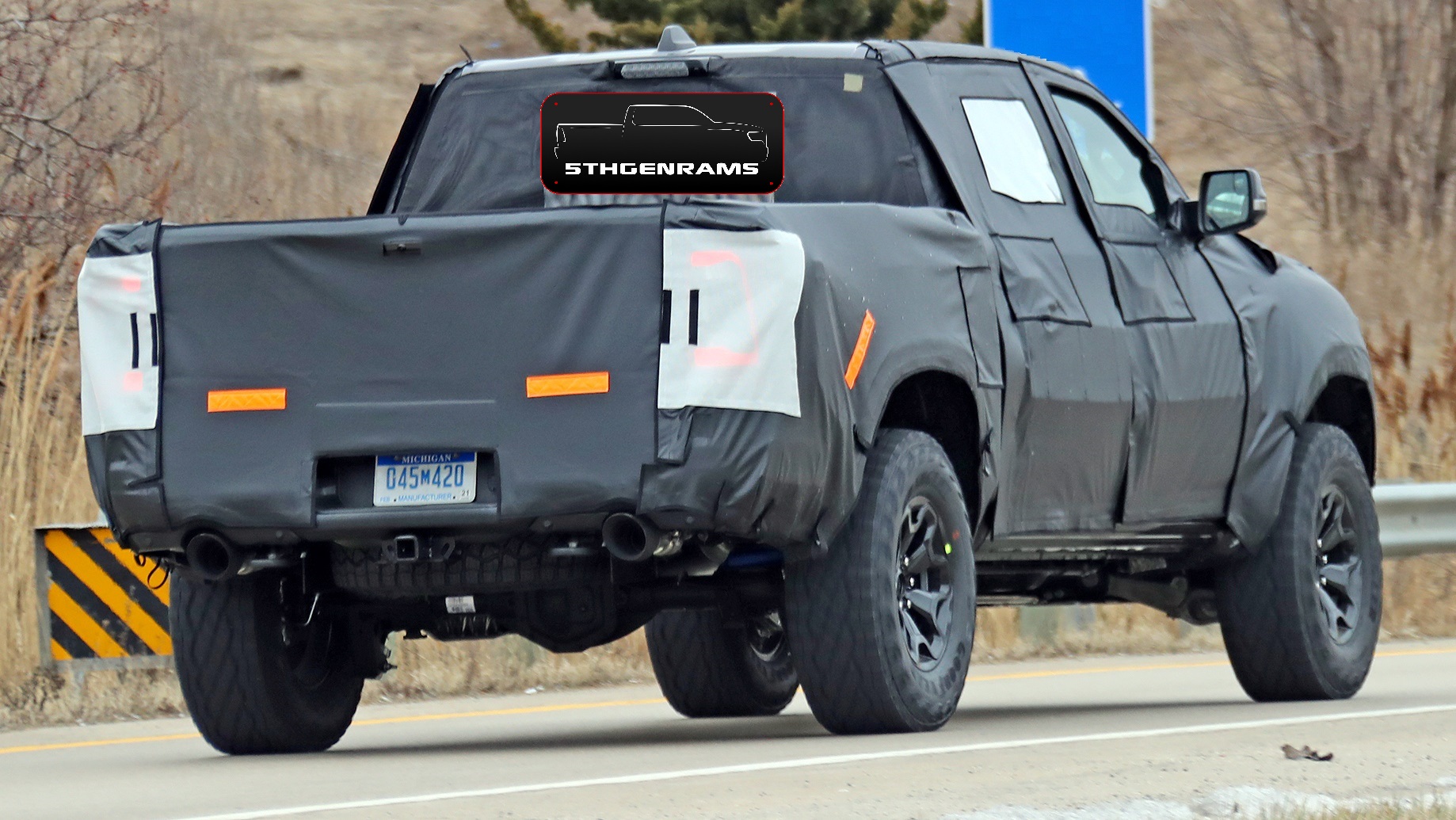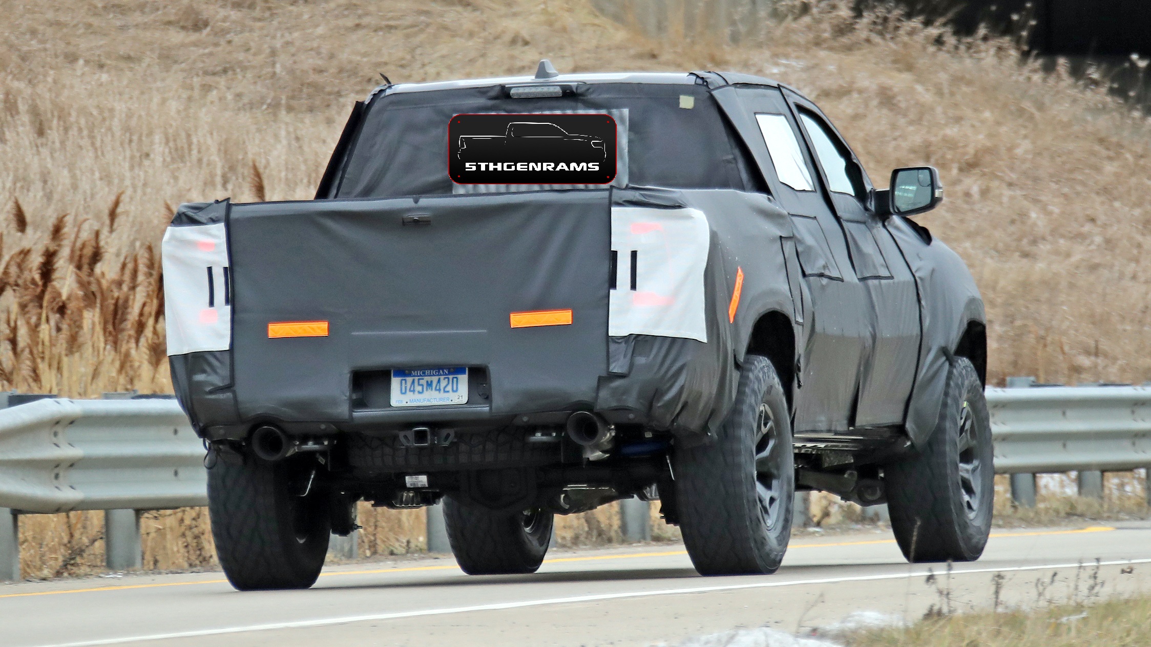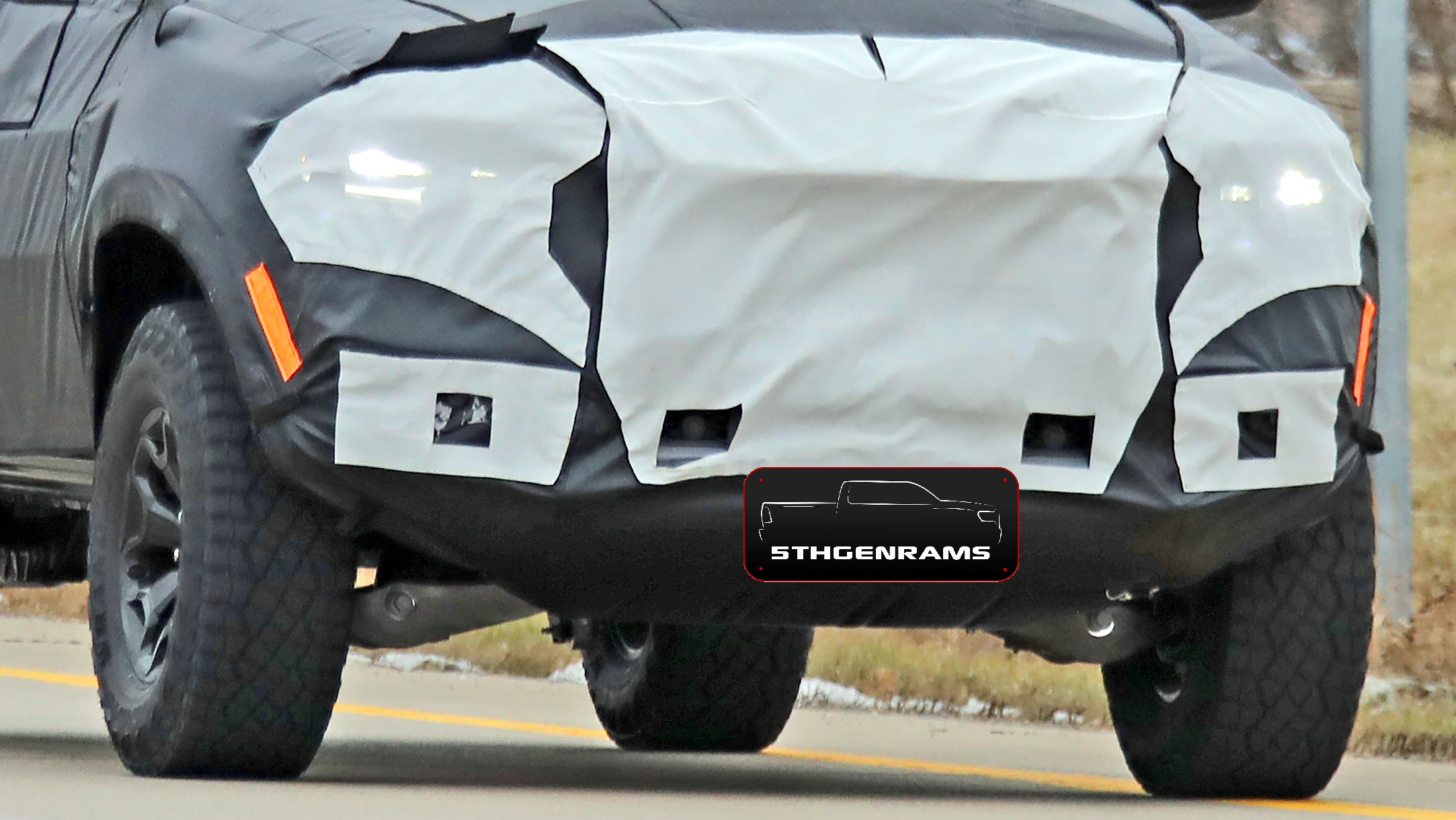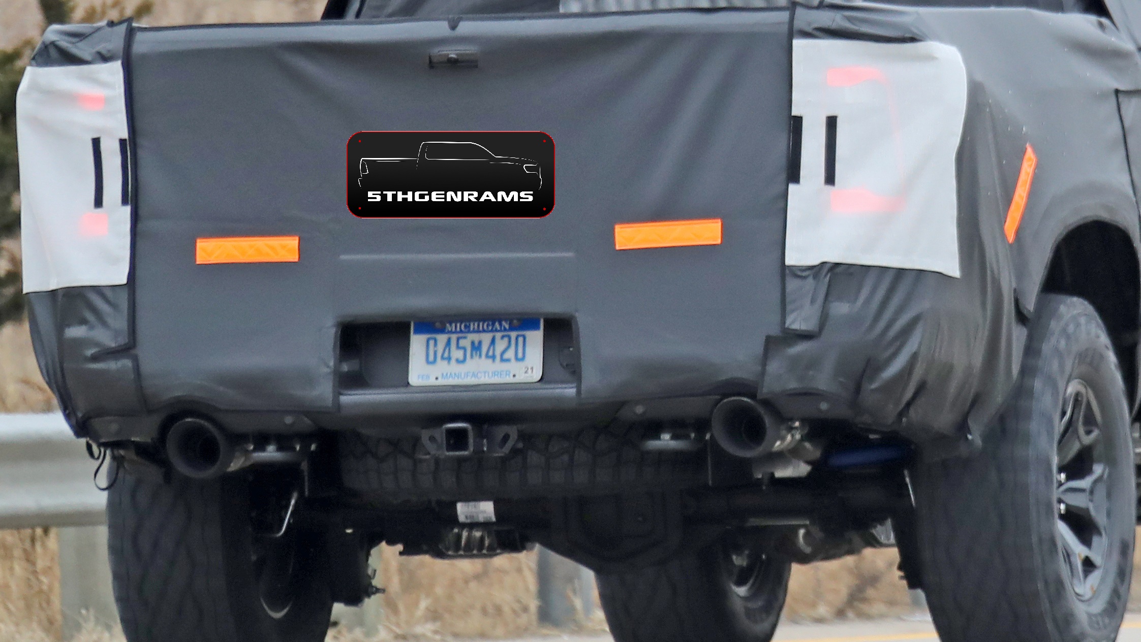 From the rear, if you look closely it appears that the rear coil springs are painted a blue color. While we still don’t know much about the suspension, we can exact Ram isn’t fooling around. Ram has had experience with putting the coil spring suspension through tough Baja conditions when it launched the Ram Runner package under the Mopar brand. The Ram Runner featured lengthened and reinforced front control arms, heavy-duty tie-rods and ball joints, with 3-inch Fox internal-bypass front and rear shocks. That truck could support 14-inches of wheel travel at both ends. Could the TRX do something similar? We will have to wait and see.