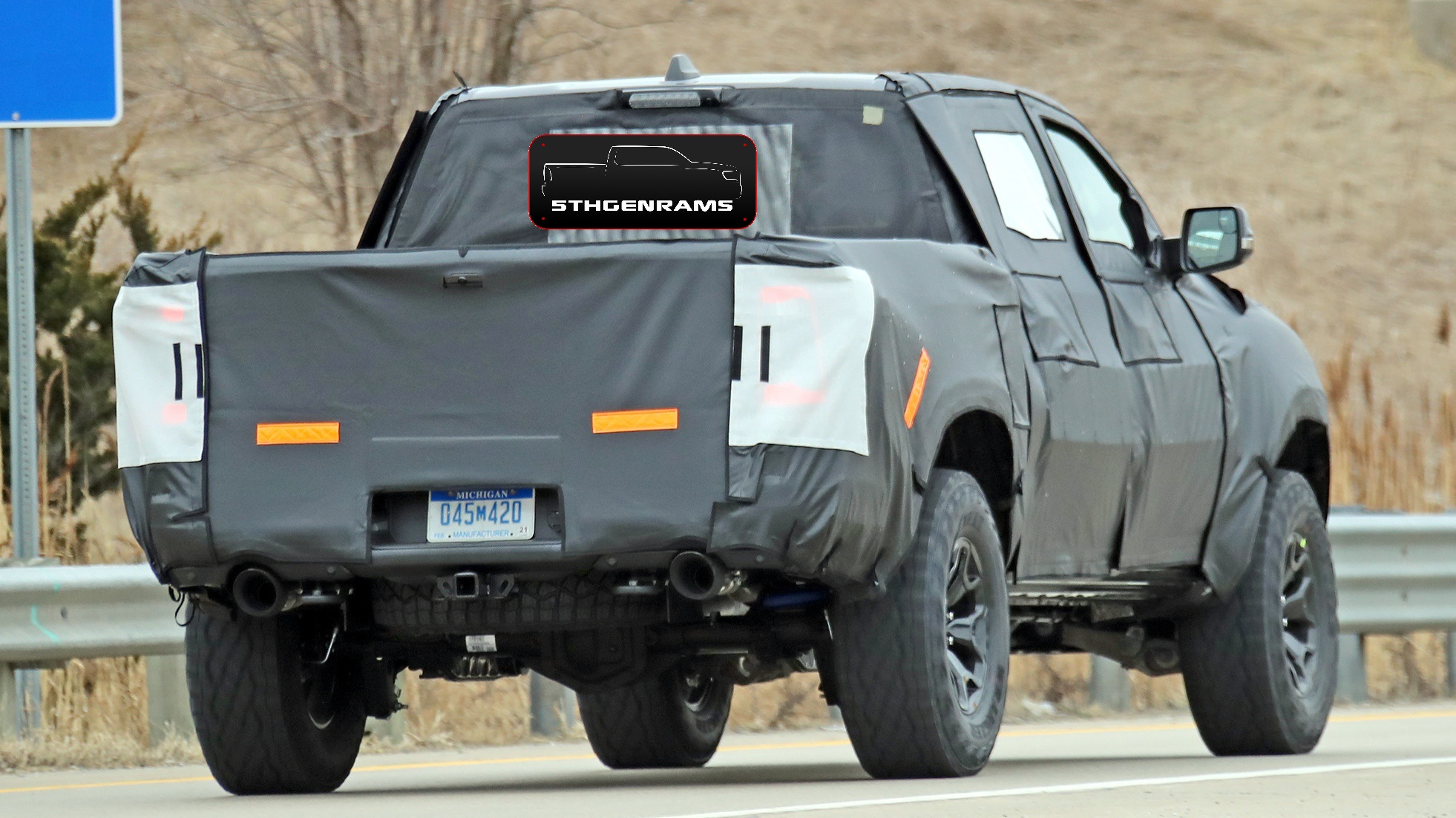 Starting off with lighting, we can tell that the production TRX will, in fact, wearing the full LED with the Adaptive Front-lighting System (AFS) as the Laramie Longhorn and Limited models. The same LED daytime running light signature can be seen poking through the camouflage, so we can more than likely expect the blacked-out units from the new 2020 Ram 1500 Limited Black to adorn the front of the truck. Tail lamps seem to be the same style as the current ones while looking at the rear, however, a brand new all-LED third brake light is a welcome addition and something we hope to see on all 2021 models. Body-colored mirrors from the Big Horn and Laramie Sport trucks appear to have also migrated over to the new TRX, to maintain that it will have a much more upscale look than what many people originally thought the truck might look like.