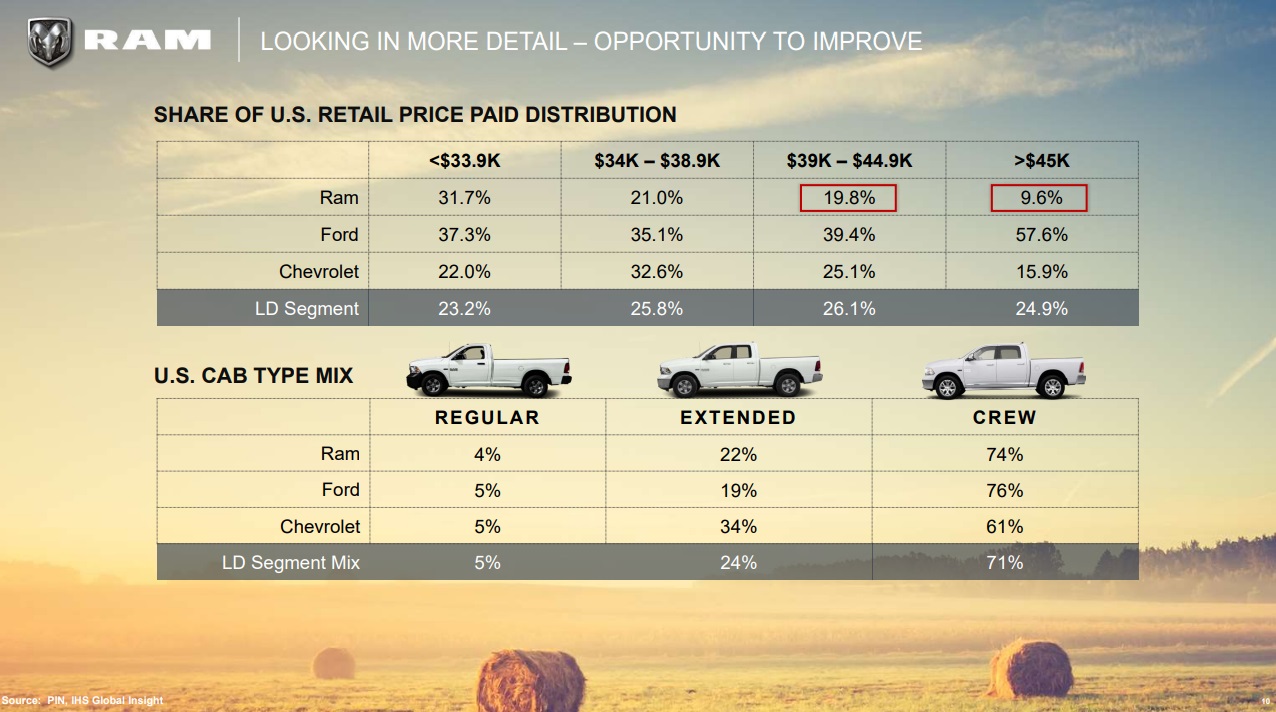 FCA is also trying to be more profitable in each of the vehicles it sales. According to the presentation the Ram brand is the lowest average transactions of any brand in both light duty and heavy duty trucks. Ram is predicting that the new Ram 1500 will have an average transaction price of $43,000US compared to the exiting Ram 1500s typical transaction of $37,000US. As for Heavy Duty Rams, the current transaction price is $50,000US and Ram is hoping the new 2020 model will push transactions to just under the average for a Ford Super Duty’s average transaction price of $56,000US.